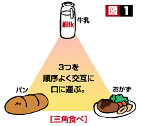 小学校の給食を思い出してください。三角食べという食べ方を教わった経験がおありではないでしょうか。パンとおかずと牛乳を三角形に見立て、交互にバランスよく順序よく食べなさいというものでした(図1)。へそ曲がりの筆者は勝手に直線食べと称して、ひとつずつ食べていたのを覚えています。今になって思えば、この三角食べは三大栄養素のバランスを意味していたのかもしれません。三大栄養素といえば、ご存じのとおり「タンパク質・脂肪・炭水化物」です。栄養素には、他にミネラルやビタミンが入ります。