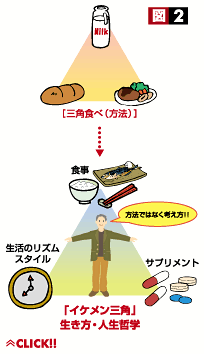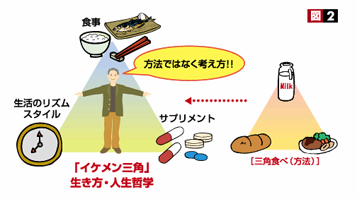 図2を見てください。三角食べは、食べ方ですが、このイケメン三角は方法ではなく、生き方そのもの、人生に対する考え方・哲学といえるでしょう。やはり何事においてもバランスが必要なようですね。