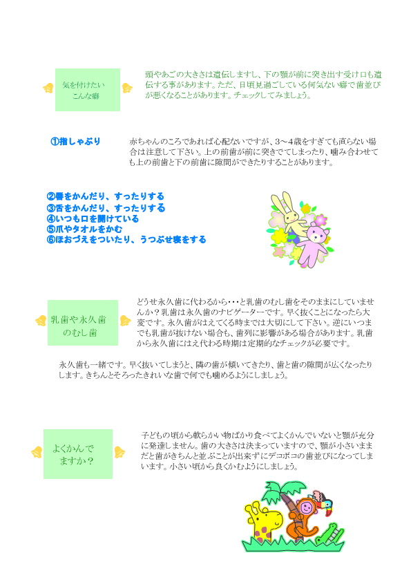 先進国の中で、日本人の歯が一番汚いのです。理由はいろいろとありますが、ともかく予防が一番です。ちなみに保険の治療だけでは完全に予防は出来ません。お子様の成人式に立派な振り袖を買ってあげるよりも、決してお金では買えない健康な歯をプレゼントされてみてはいかがですか。